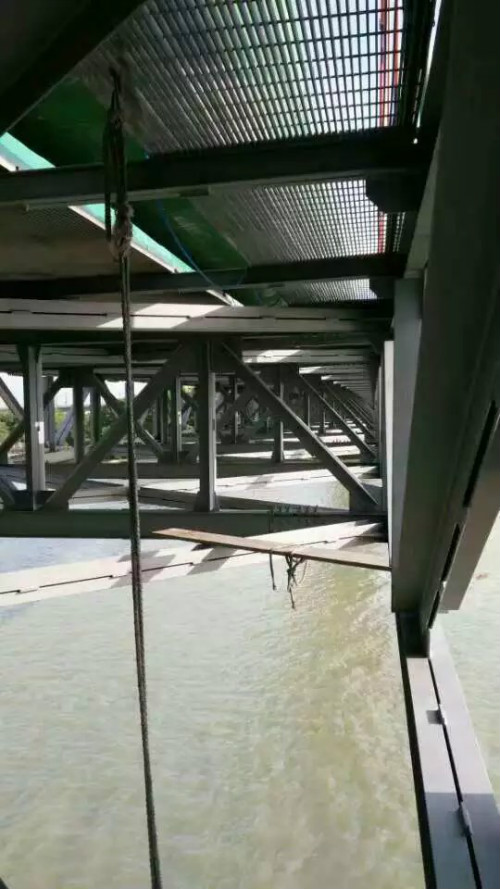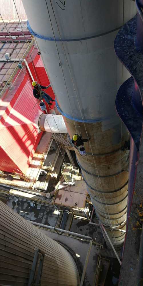根据多年经验和实际情况,采用无脚手架悬吊作业法进行施工。施工方法施工人登高到烟囱顶口平台,将二根20 的尼龙绳带上,固定在烟囱顶部平